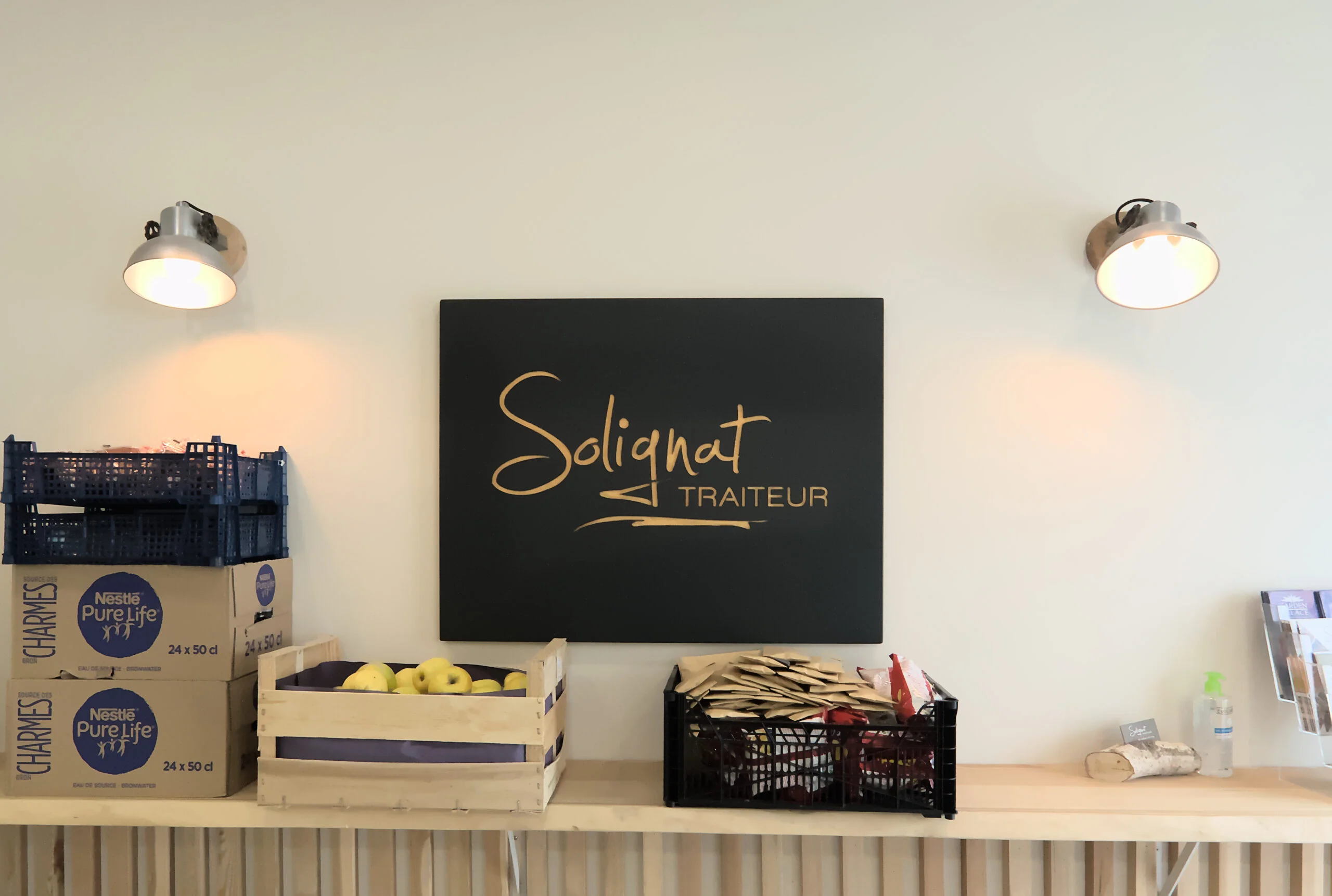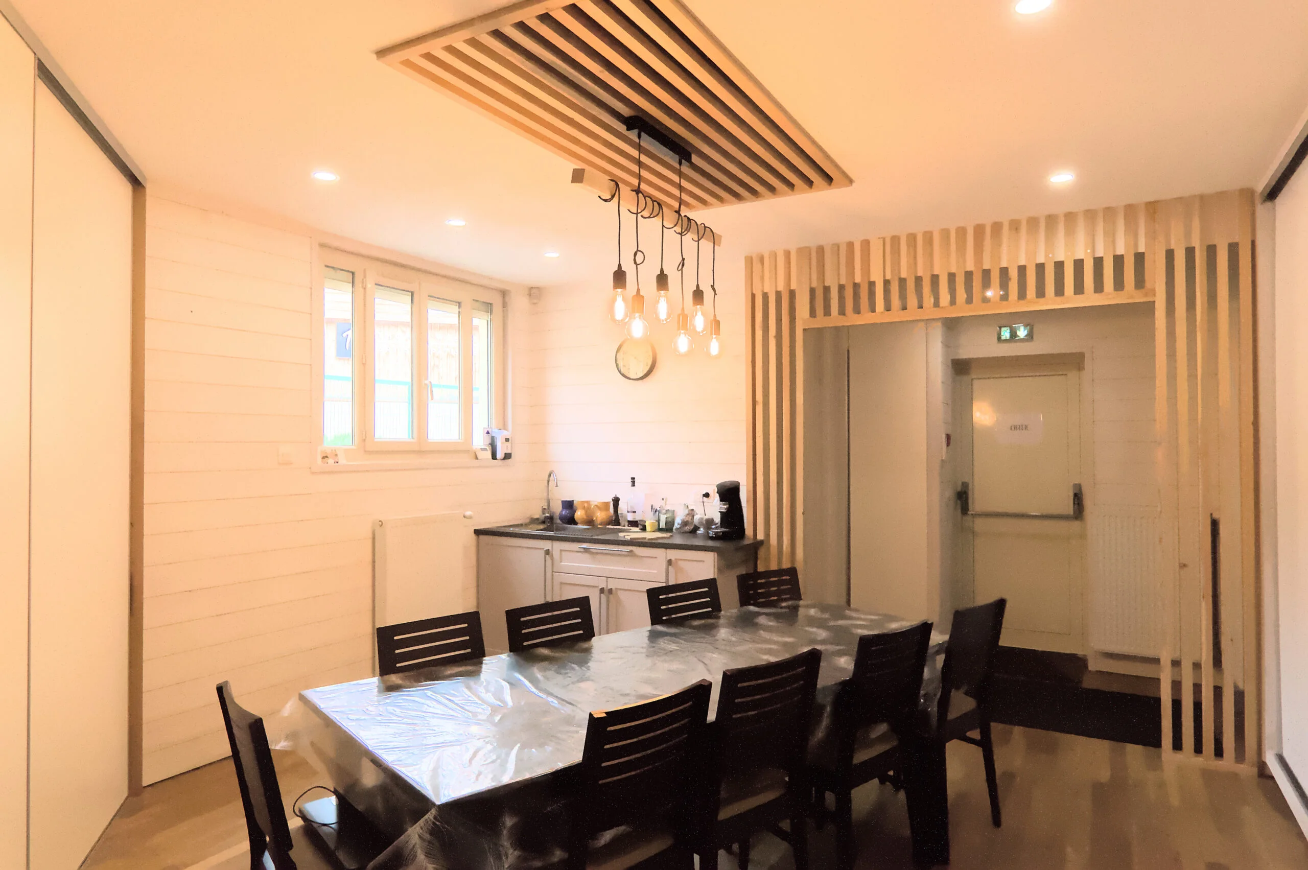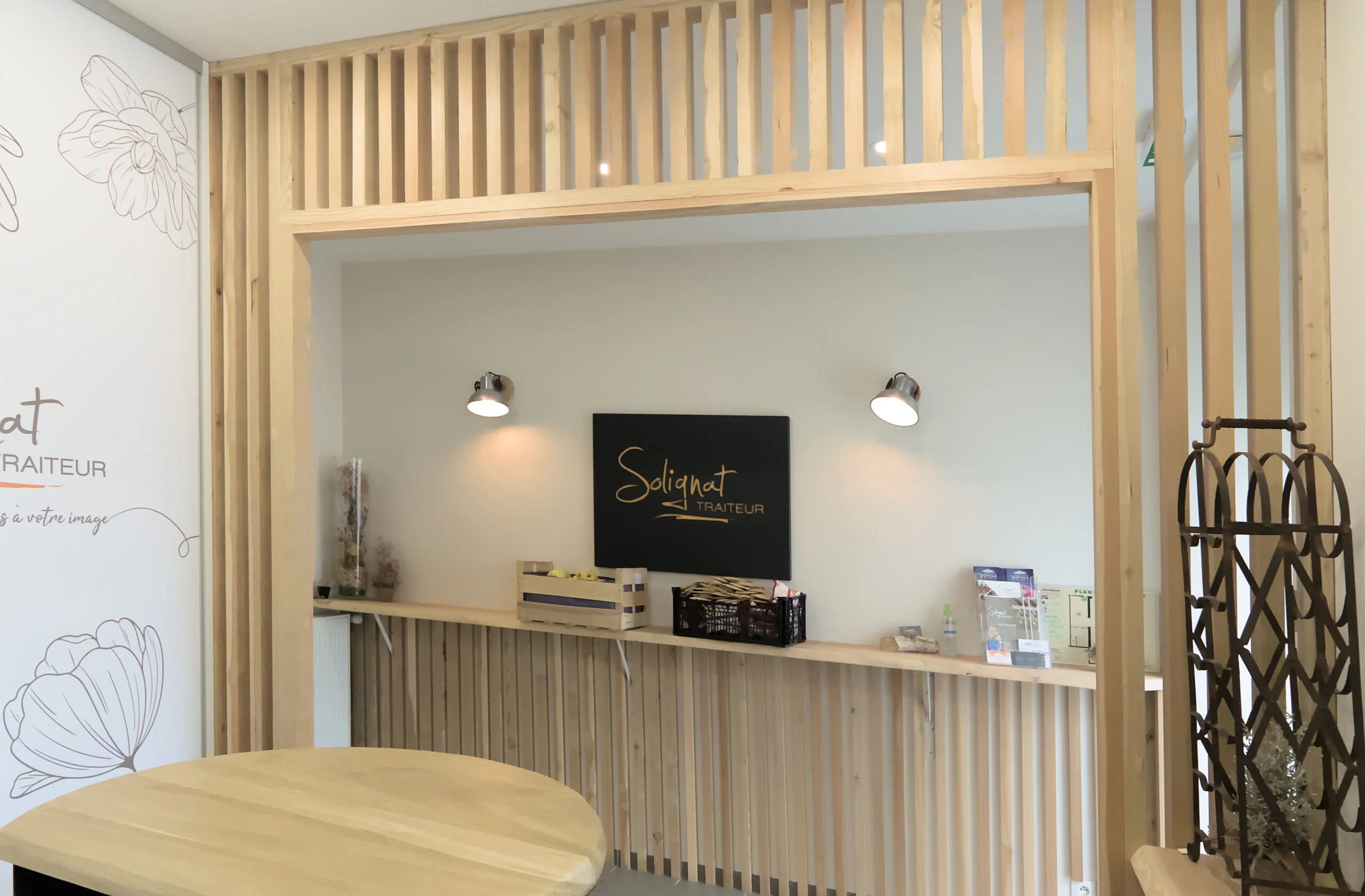 Ainsi, nous avons repris une cloison ajourée identique à celle utilisée dans l’espace des bureaux pour créer une continuité. Cet aménagement intérieur est plus moderne et permet de disposer les plats qui vont être livrés sur des tablettes autour de la pièce et d’encaisser sur le meuble rond au centre. Un réfectoire a été aussi rénové lors de ces travaux. C’est un espace qui permet aux équipes de se restaurer et aussi de faire déguster des menus pour les clients de l’offre de mariage.